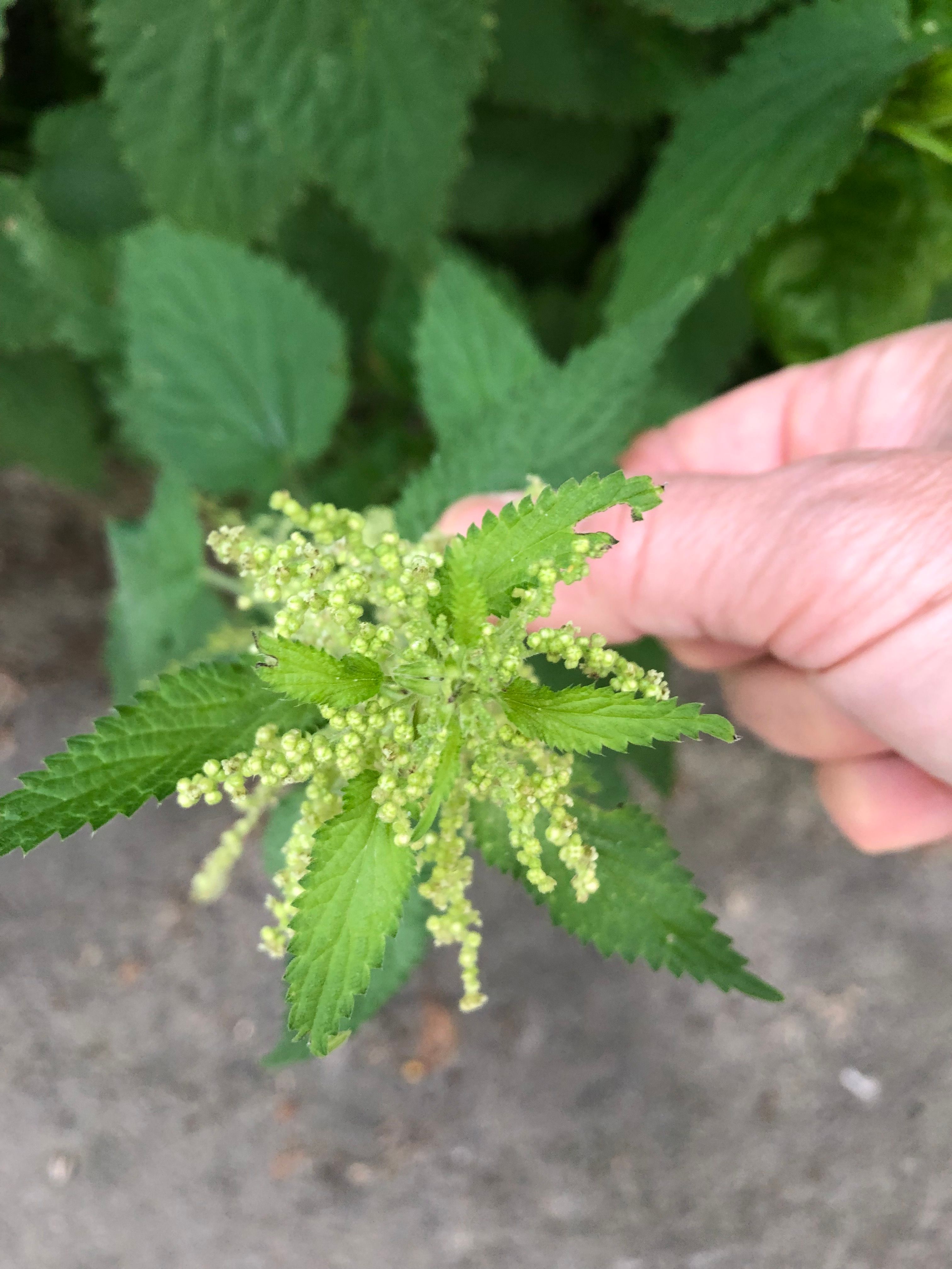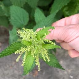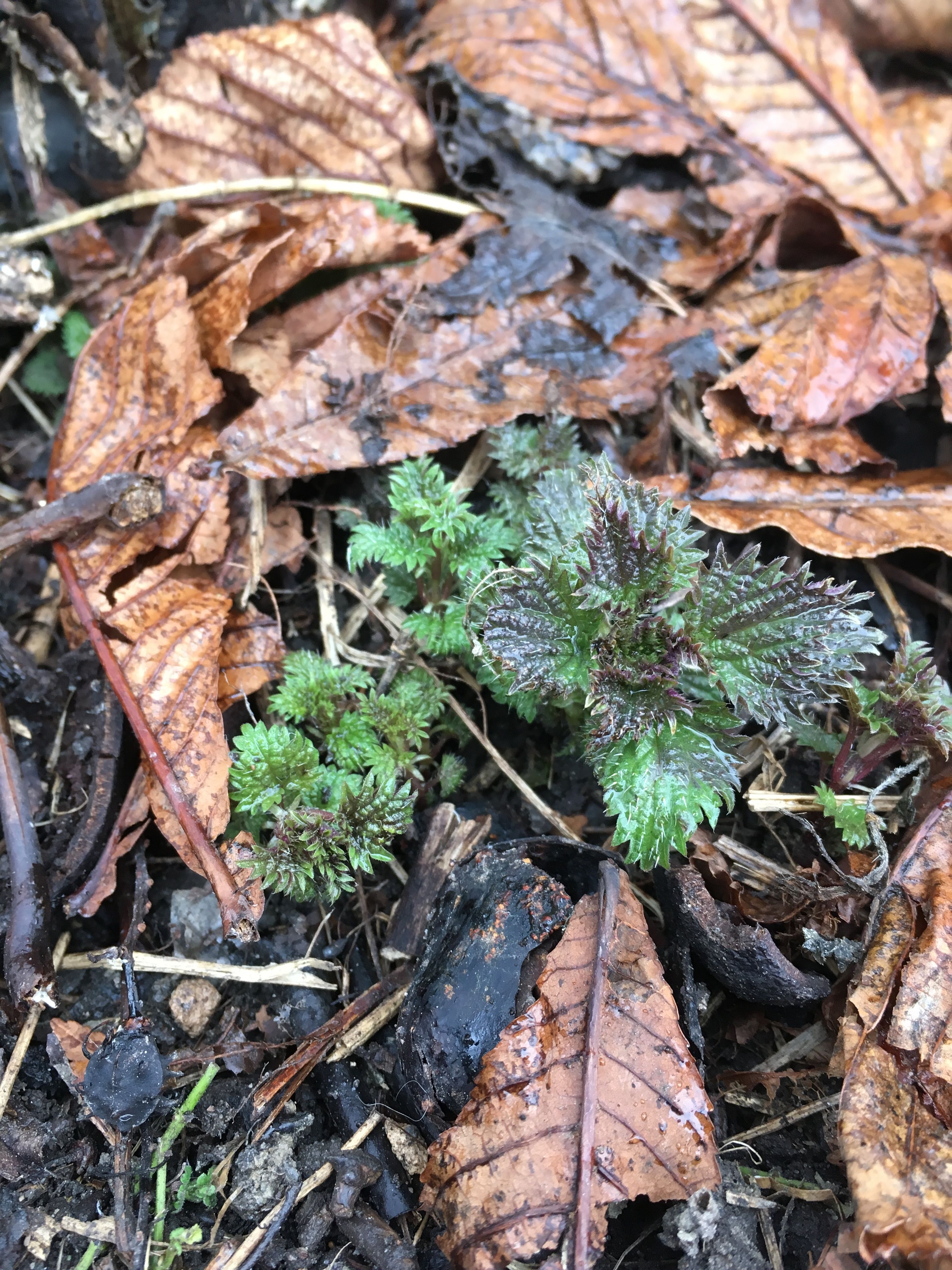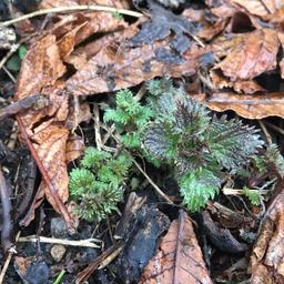 Vårens spirer har mørke grønne mot lilla blader. Bladene sitter parvis på stengelen. Brennhår.